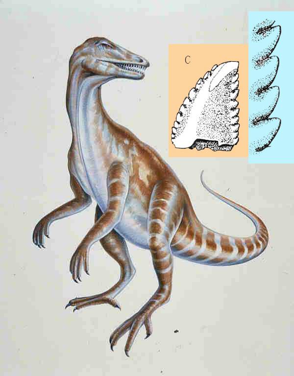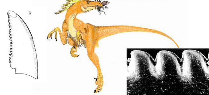 由于時代久遠,這些迷人的生物給我們留下的可供研究的痕跡并不多,保存完整的骨架就更是少之又少。而牙齒因為相對較小,質地堅硬,表面還有釉質保護,易于保存。所以牙齒化石就成為最常見的恐龍遺跡。隨著恐龍學家們對牙齒研究的深入,已能通過牙齒鑒別出恐龍的大致種類。1990年,加拿大艾伯塔省的Philip Currie 就利用牙齒鋸齒的形態特征的變化將當地生活在晚白堊世 (Late Cretaceous)的獸腳類的恐龍分為四大類:馳龍(Dromaeosaurinae):大名鼎鼎的恐爪龍就屬于這一類;伶盜龍(Velociraptorinae);傷齒龍(Toodontidae);暴龍(Tyrannosauridae).