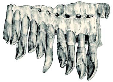 這些形狀各異的牙齒是怎樣工作的,要解決這個復雜問題,遠比推斷肉食恐龍難得多。因為他們跟現今的素食動物的牙齒實在相差太遠。這些有著明顯磨痕的牙齒可以進行原始的咀嚼嗎?各種答案中唯一可以肯定的是:如果他們能在一定程度上嚼碎樹葉,整個過程也是僅限于垂直方向。因為關節的構造說明了下頜無法在水平方向上運動。而且牙齒上的磨蝕面也證明了這一點。如果你認真觀察牛羊吃草或者反芻,會發現他的下頜左右晃動的很厲害。正是這種運動,配合臼齒寬大多嵴的咀嚼面,把草料充分磨碎。雖然近來的研究發現有些進步的鳥腳類(禽龍和鴨嘴龍類)已經演化出比較進步的取食機制,也可以上下頜橫向移動,雖然沒有幅度那么大。咬合時,上頜斜向外,下頜斜向內,產生原始的“咀嚼”,但大多數恐龍只能用大量的牙齒上下相對的擠壓切割,把枝葉咬碎。