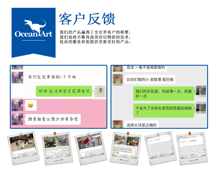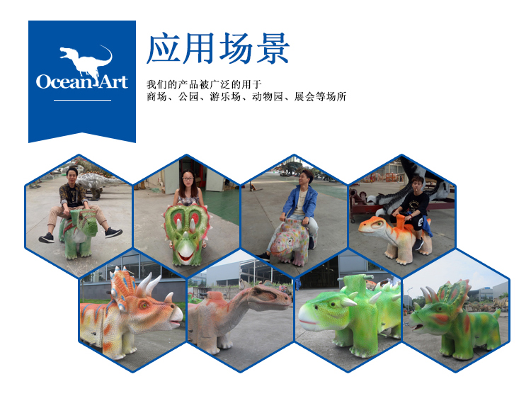 備注:我們注重展覽和產品本身的文化底蘊及科技含量,并且關注產品與觀眾的互動性、娛樂性和參與性,因此,我們先后推出了騎乘恐龍、打斗恐龍組、生蛋龍、蓋章恐龍、恐龍衣服等一系列,科技含量高,故事情節豐富,娛樂參與性極強的產品,深受廣大消費者的青睞。除了產品的研發與制造,公司的營銷核心是一套成熟的、創新性的展覽理念,并在海內外都取得了廣泛的成功!
