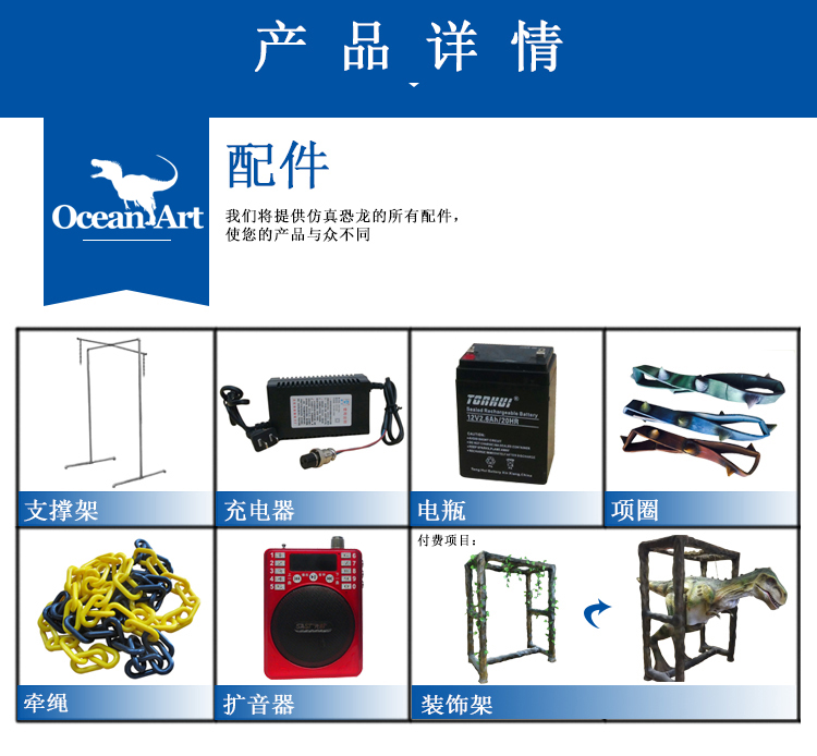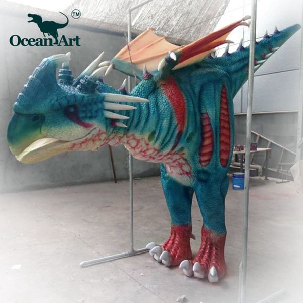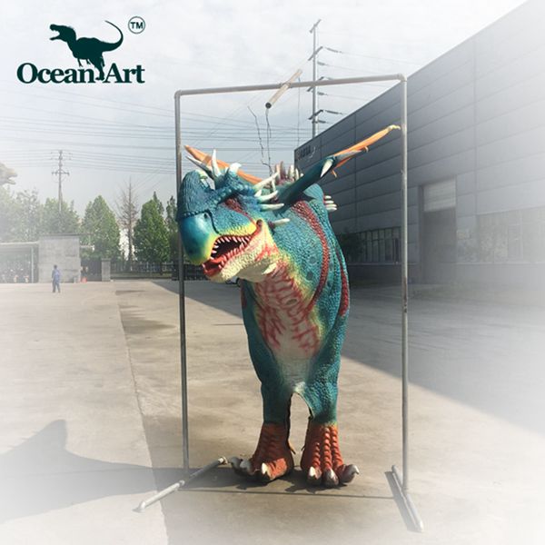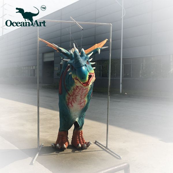 1.人控恐龍分為藏腿或露腿兩種設計,服裝長約4米,重20千克。藏腿恐龍服在腿和腹部處有一條拉鏈,當操作者穿好后,拉上拉鏈便可完全遮住身影;露腿恐龍服則會把操作者雙腿露在外面。尾部有一條可抽出的長桿,便于裝箱運輸。另外,我們會提供一個支撐架,方便擺放恐龍服裝。